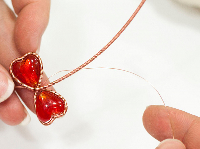 15. Таким же образом оборачиваем проволоку вокруг второго сердечка, так же фиксируя бусину в уголке из проволоки.