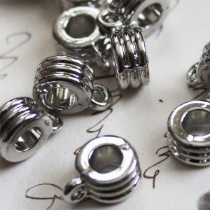 4. Звено с каплей присоединяем к бейлу, зажимаем до конца петлю. Далее нужно нанизать на пин с кольцом бейл, по бокам которого находятся рондели, плоские металлические, а затем круглые металлические бусины.