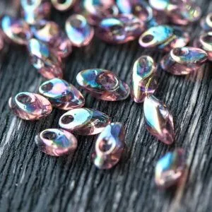 5. Для второго и следующих рядов мы берем мелкий бисер. Нанизываем 1 бисеринку и продеваем леску сразу в 2 бисеринки первого ряда, методом обратный стежок.