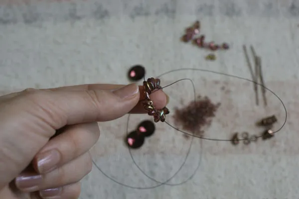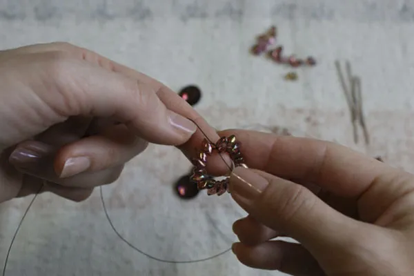 2. Бисеринки должны быть в одном направлении. Замыкаем их в круг и завязываем двойной узел, не сильно крепко.