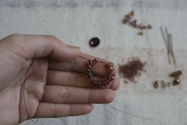 11. Повторяем до конца ряда и леску без бисера продеваем в первую бисеринку предыдущего ряда. Четвертый и последующие ряды будут идти на сужение (уменьшение)
