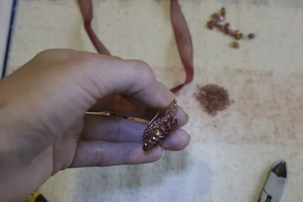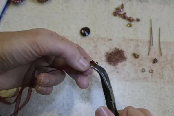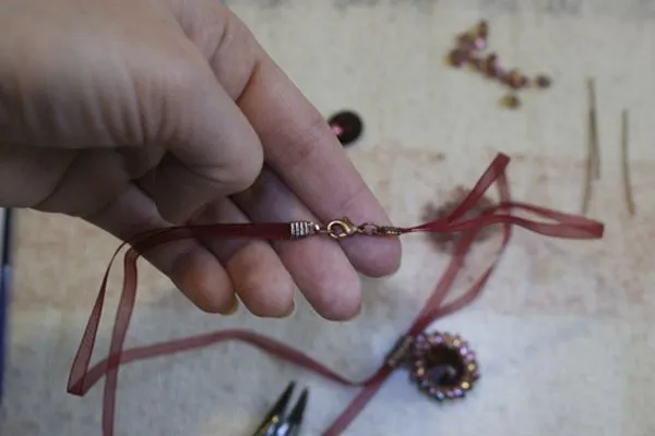 23. Соединим петельку на нашем кабошоне и бейл кольцом. Продеваем через бейл ленту. Крепим зажимы на краях ленты. Присоединяем замочек.