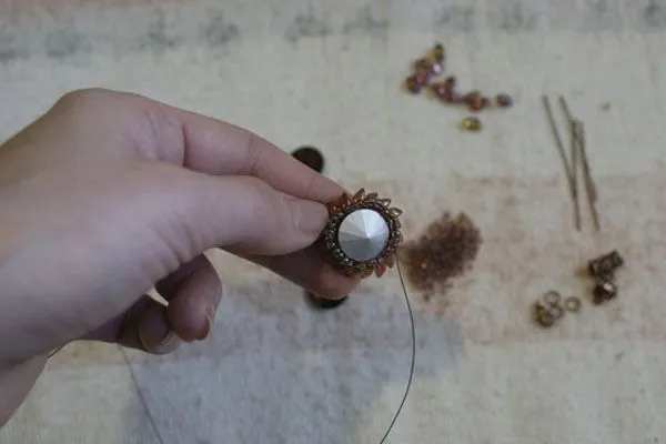 17. Оплетение закончили. Рабочую нить мы продеваем от середины плетения к краю нашего кабошону, к месту начала плетения в первом ряду.