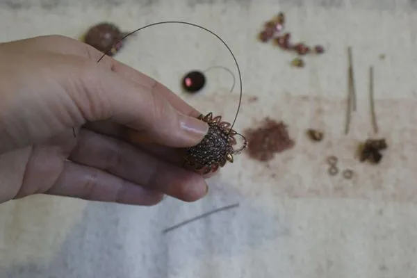 12. Поэтому количество бисеринок в ряду нужно будет уменьшить, пока плетение полностью не закроет внутреннюю сторону кабошона.