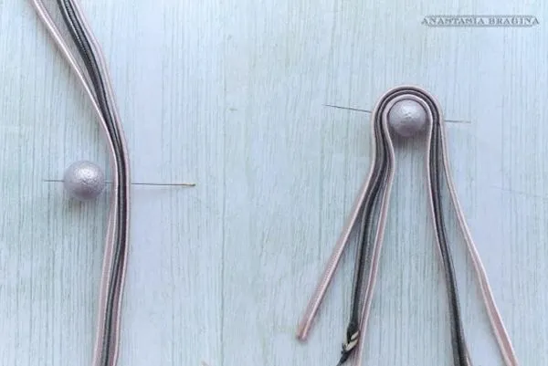 1. Заготовьте 4 розовых и 2 серых сутажных отрезка длиной по 15 см. Кончики отрезков обработайте клеем, чтобы не пушились.