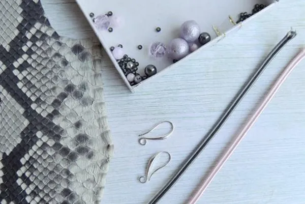 17. Приклейте кусочки кожи к сережкам, дайте клею подсохнуть и обрежьте кожу по контуру сережек. Пришейте кожу к сутажным элементам зацепляя иголкой лишь самый край сутажа.