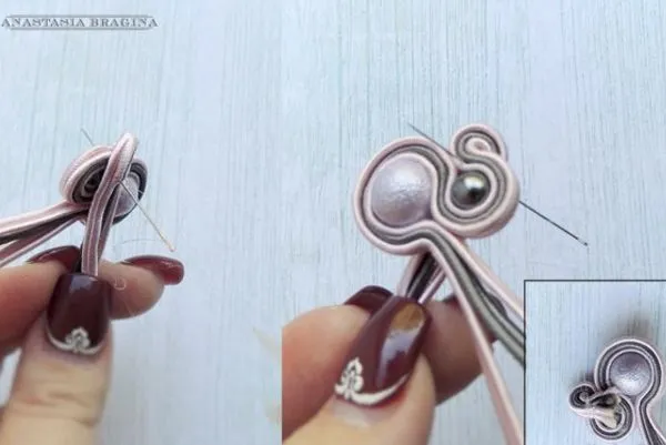 4. Уводите иголку выше жемчужины и сшивайте все сутажные слои 5-6 стежками. Затем три свободных сутажных отрезка уводите на изнанку сутажного элемента и там фиксируйте.