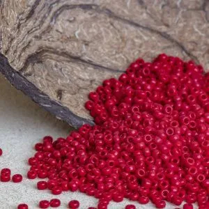 6. Для обработки края беру мононить. С изнанки ввожу иглу с нитью и кладу бисеринку отверстием вверх. Прохожу через отверстие иглой еще раз, затягиваю.