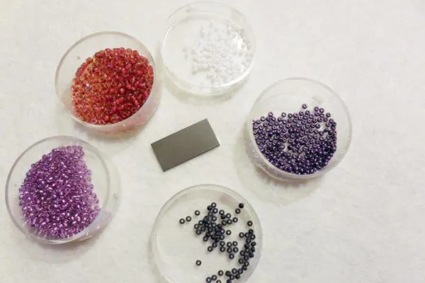 5. Выводим иглу на первоначальном месте, проводим через эти две бисеринки и набираем следующие две. Снова делаем стежок по их размеру.