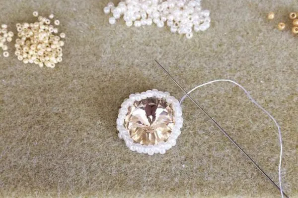 7. Теперь выводим нить на другую сторону, к лицу нашей ривольки. Проходим ряд бисером 15/0.