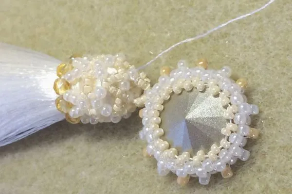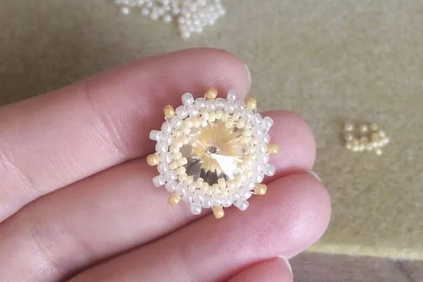 21. Выводим нить из бисерины 11/0 центра оплётки риволи, на фото видно откуда выходим