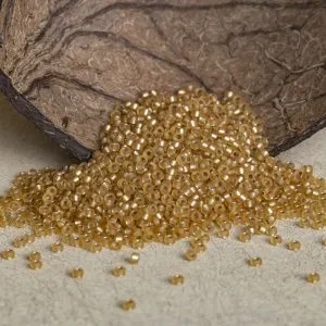 15. Теперь выводим нить из средней 11/0 и нанизываем уже в обратном порядке – 1 одиннадцатую, 1 пятнашку и снова 1 одиннадцатую. Проходим нитью в соседнюю 11/0.