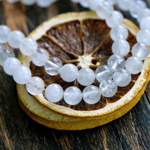 1. Берем бусины кварца и аметиста 8 мм и нанизываем на мемори проволоку. Середину выделяем дополнительно маленькими шапочками. Первая часть нашего браслета готова.