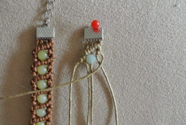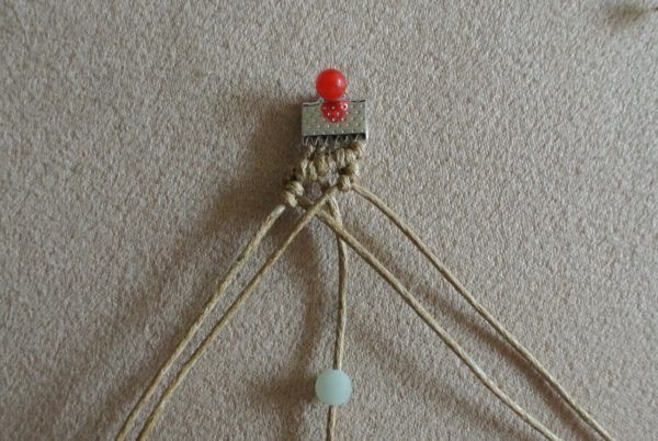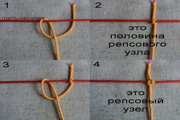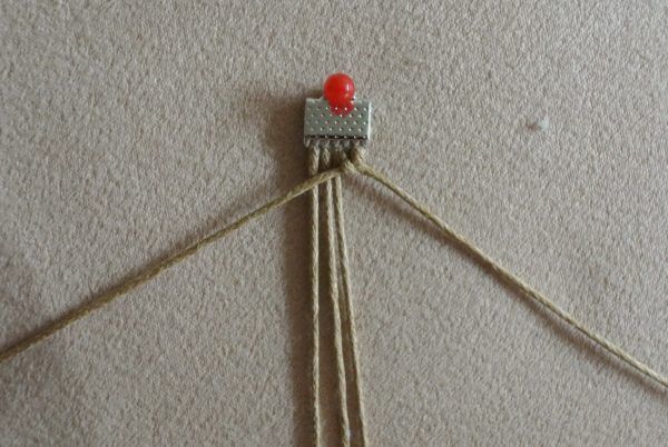 2. Плетем ряд репсовых узлов, используя крайнюю правую нить как основу. Нить-основу располагаем под углом 45 градусов к концевику. Всего делаем 4 узла – по одному узлу каждой рабочей нитью.