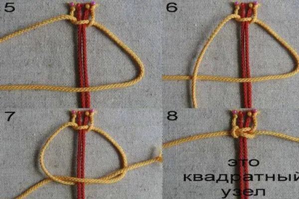10. Закругляем браслет, как показано на фото, и плетем застежку из четырех квадратных узлов. Основой здесь служат обе нити браслета, рабочей нитью – отдельная нить 20 см.