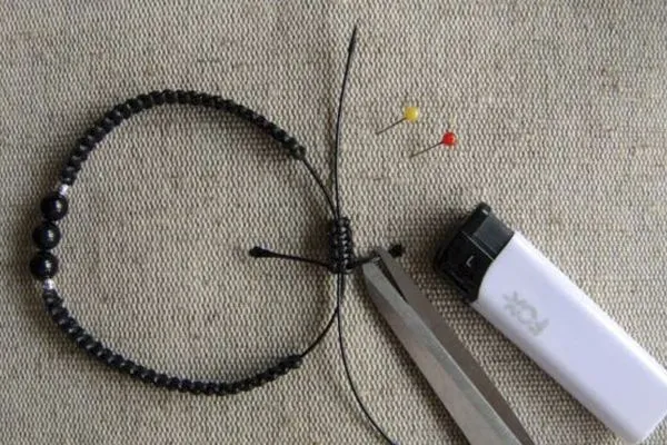 13. Оформляем концы браслета: надеваем металлические бусины-шарики, обрезаем излишки нитей, оставив 5-6 см, подпаливаем концы.