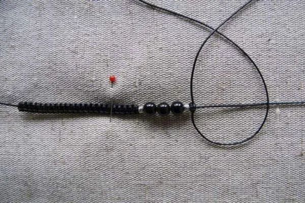 3. Берем основу браслета – нить 40 см, надеваем на нее 3 бусины из агата по центру и 2 металлические бусины с орнаментом по бокам. Помещаем все бусины на середину нити.