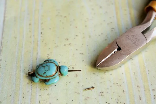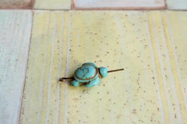 6. Для этого можно разжать либо звено цепи, либо петельку, а потом зажать. Берем следующую черепаху и пин, и снова подрезаем пин, делаем колечки и присоединяем её к цепи. Обратите внимание, что все черепахи идут в одном направлении